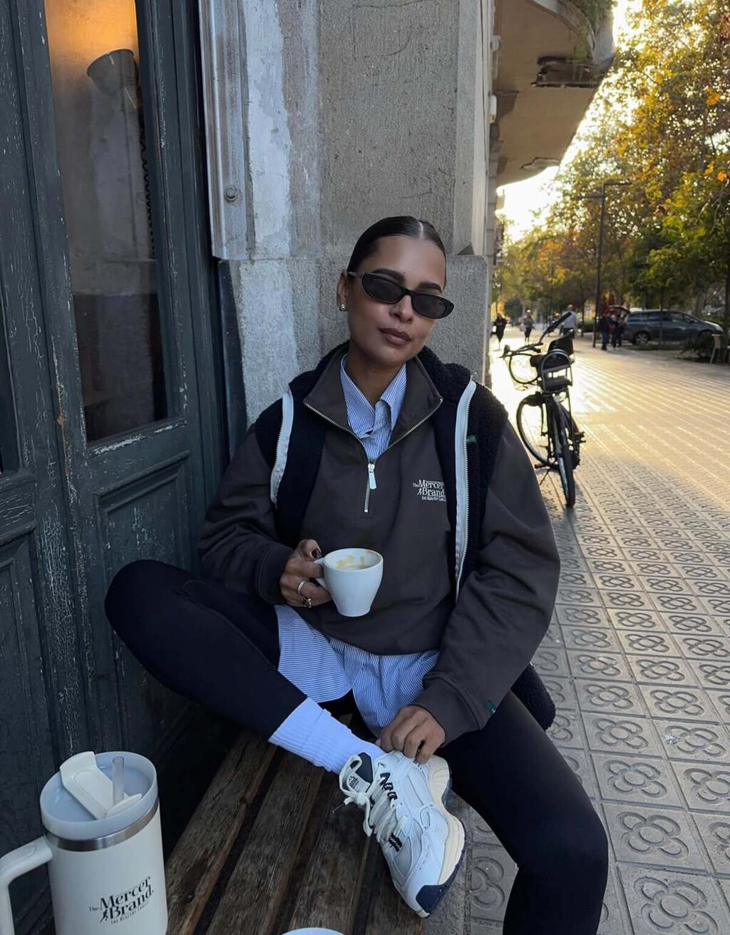 La forme tabi — cette séparation de la chaussure inspirée des chaussons japonais — a migré des ballerines vers les sneakers, et le résultat séduit. Le coloris marron chocolat de la Nike Rift W est chaleureux et se marie parfaitement aux teintes automnales. Ces sneakers sont un excellent choix pour celles qui veulent suivre une tendance pointue tout en restant dans des tons faciles à assortir, notamment avec des looks casual chic ou des robes midi en maille.