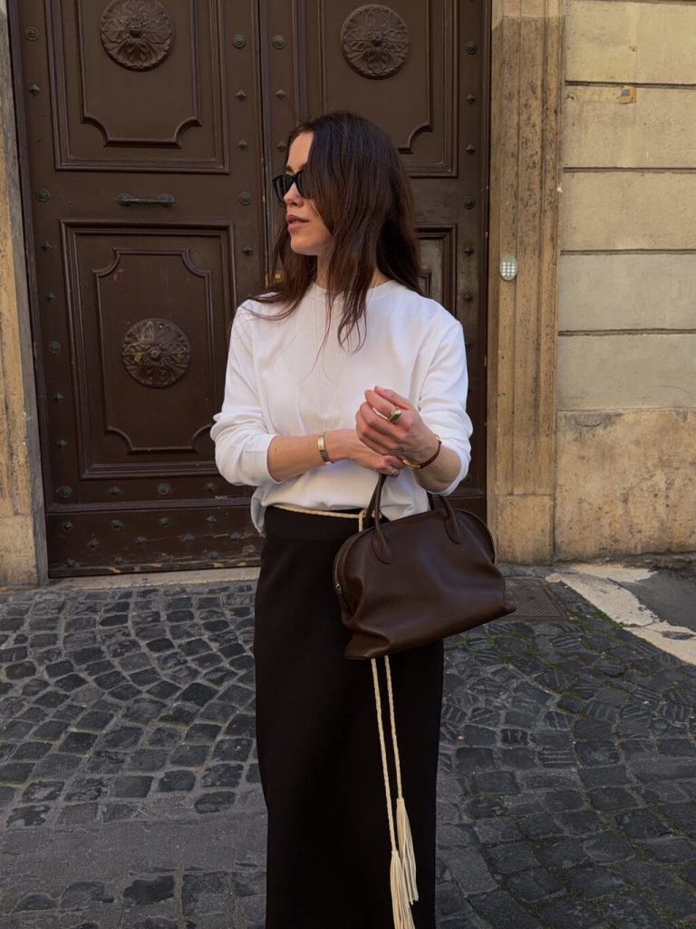 Une jupe longue devient une pièce de caractère avec les bons accessoires : une ceinture fine pour structurer, des bijoux dorés pour réchauffer les tons moutarde ou chocolat, et des sacs en osier pour les journées d’été. Pour les chaussures, les sandales à plateforme allongent la silhouette, les ballerines apportent une touche rétro, et les baskets blanches donnent un twist contemporain.