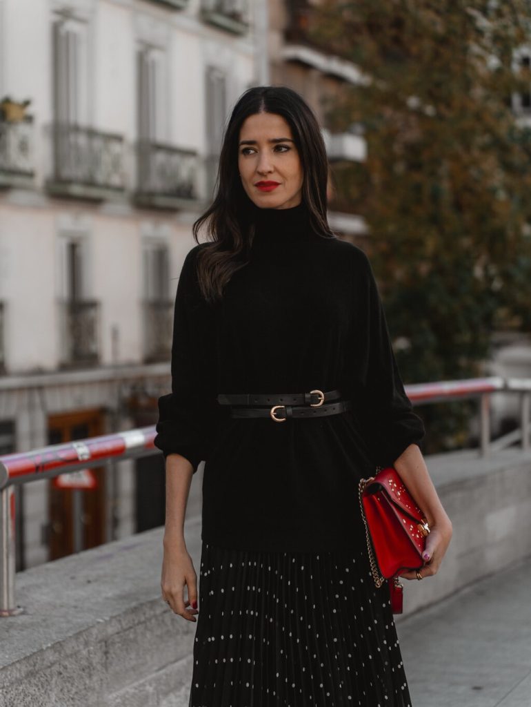 Si vous souhaitez faire de la jupe la pièce maîtresse d’une tenue de soirée ou d’un dîner, combinez-la avec une blouse soignée. Une blouse fluide, une chemise demi-transparente ou même une version en satin feront monter le ton. Choisissez des accessoires délicats : boucles d’oreille fines, pochette structurée et une paire d’escarpins ou sandales à talons pour prolonger la jambe. Le motif à pois suffira à donner du caractère à la tenue ; gardez le reste épuré pour éviter la surcharge.