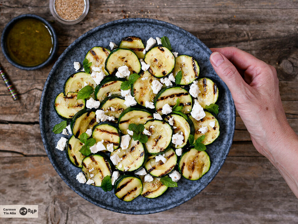 • Dans la même poêle, versez l’huile d’olive restante et faites dorer l’ail quelques secondes. Ajoutez les courgettes, salez légèrement et intégrez les feuilles de menthe ciselées.