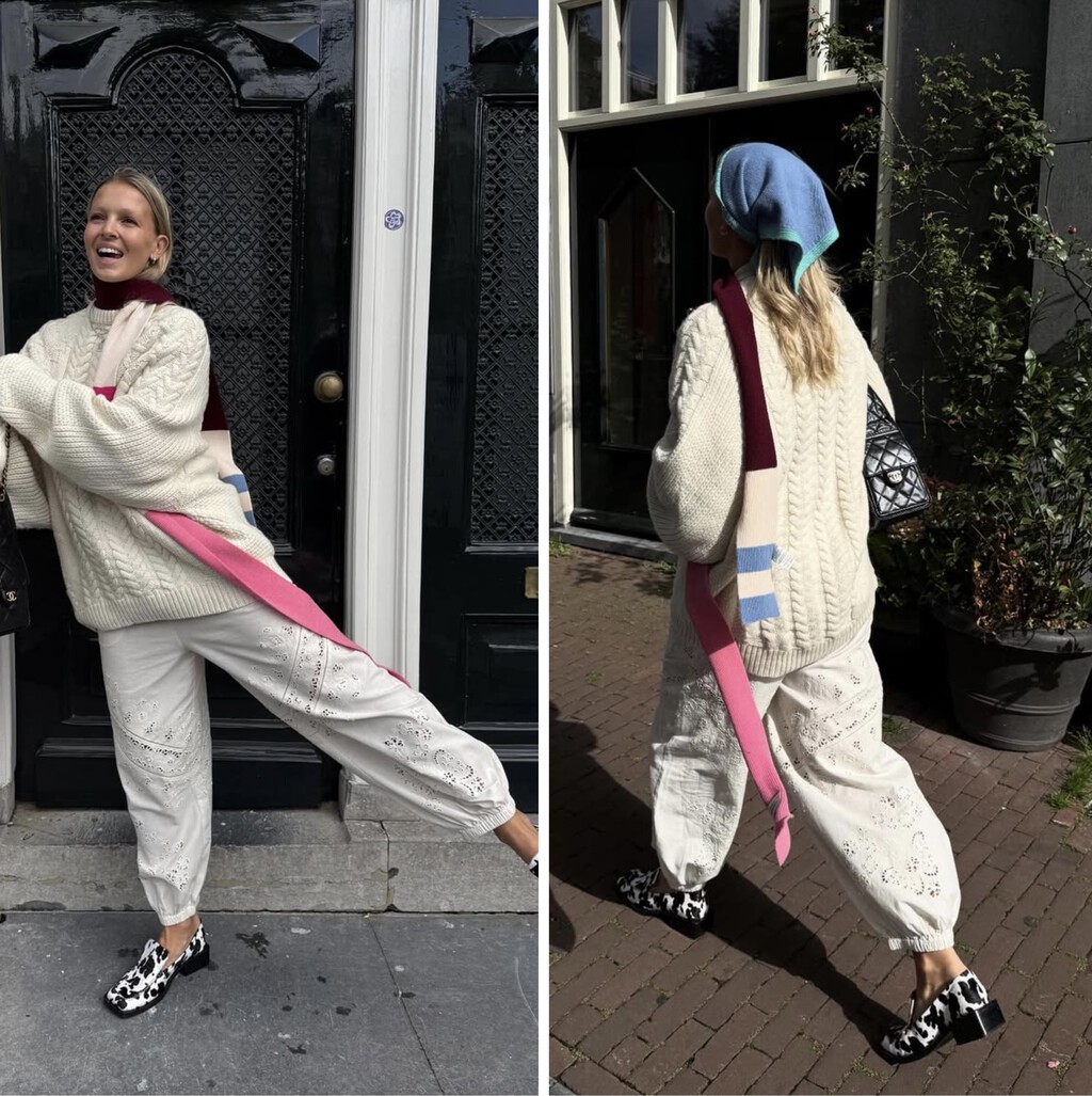 • Silhouette en V : jouez l’oversize en haut aussi, avec un pull chunky légèrement rentré pour créer un ensemble harmonieux.