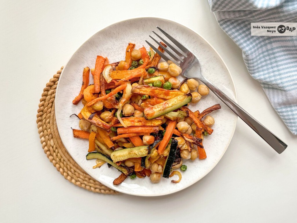 Une fois les légumes tendres mais encore intacts, ajoutez les pois chiches égouttés et mélangez. Prolongez la cuisson de 5 minutes à 180 °C. Cette étape permet aux pois chiches de sécher légèrement en surface, devenant croustillants à l’extérieur tout en restant moelleux à l’intérieur.